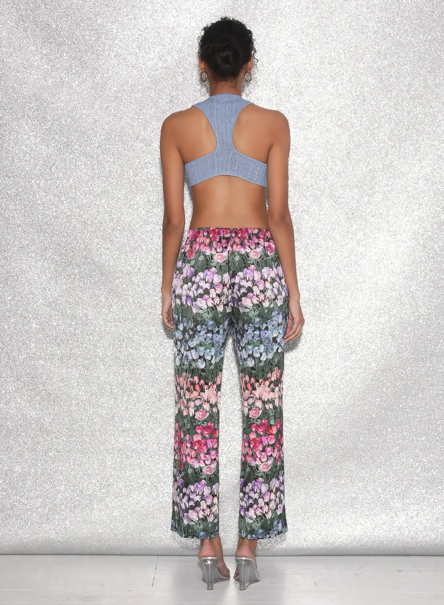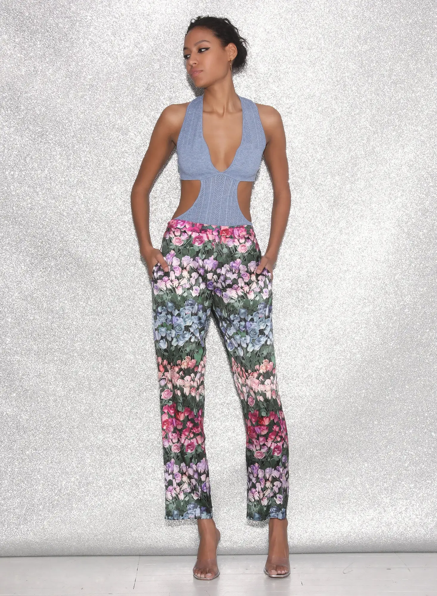 Wear the pants. Our ultra luxe Rose Stripe Pant features custom floral rose stripe print with elastic waist and pockets. Looks chic with the Pointelle Cutout Bodysuit.