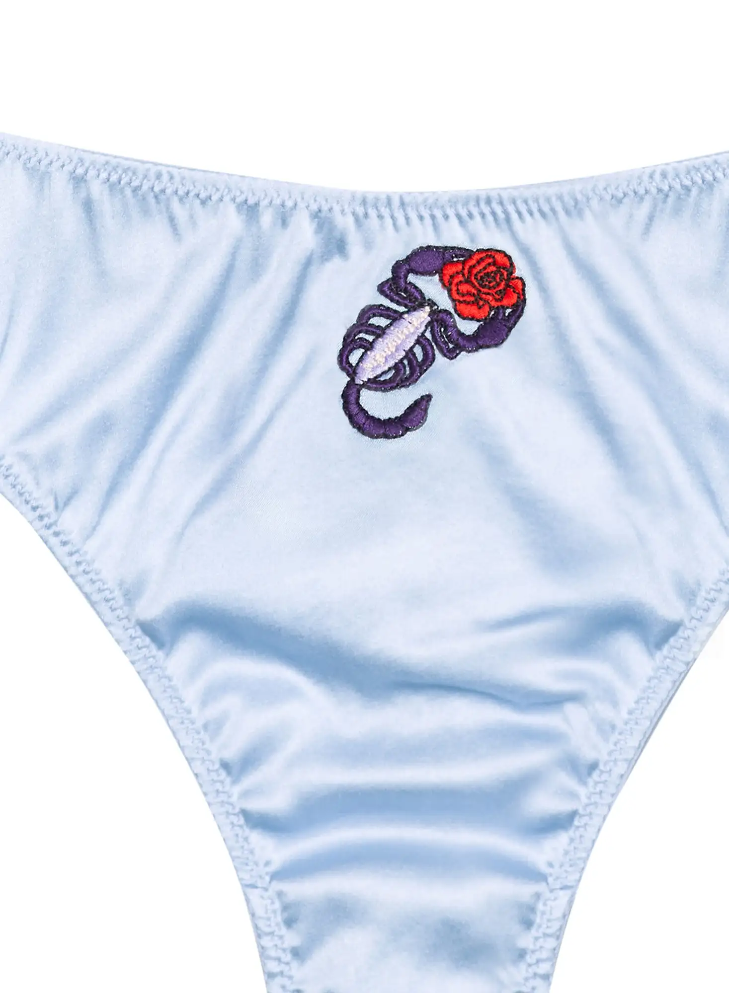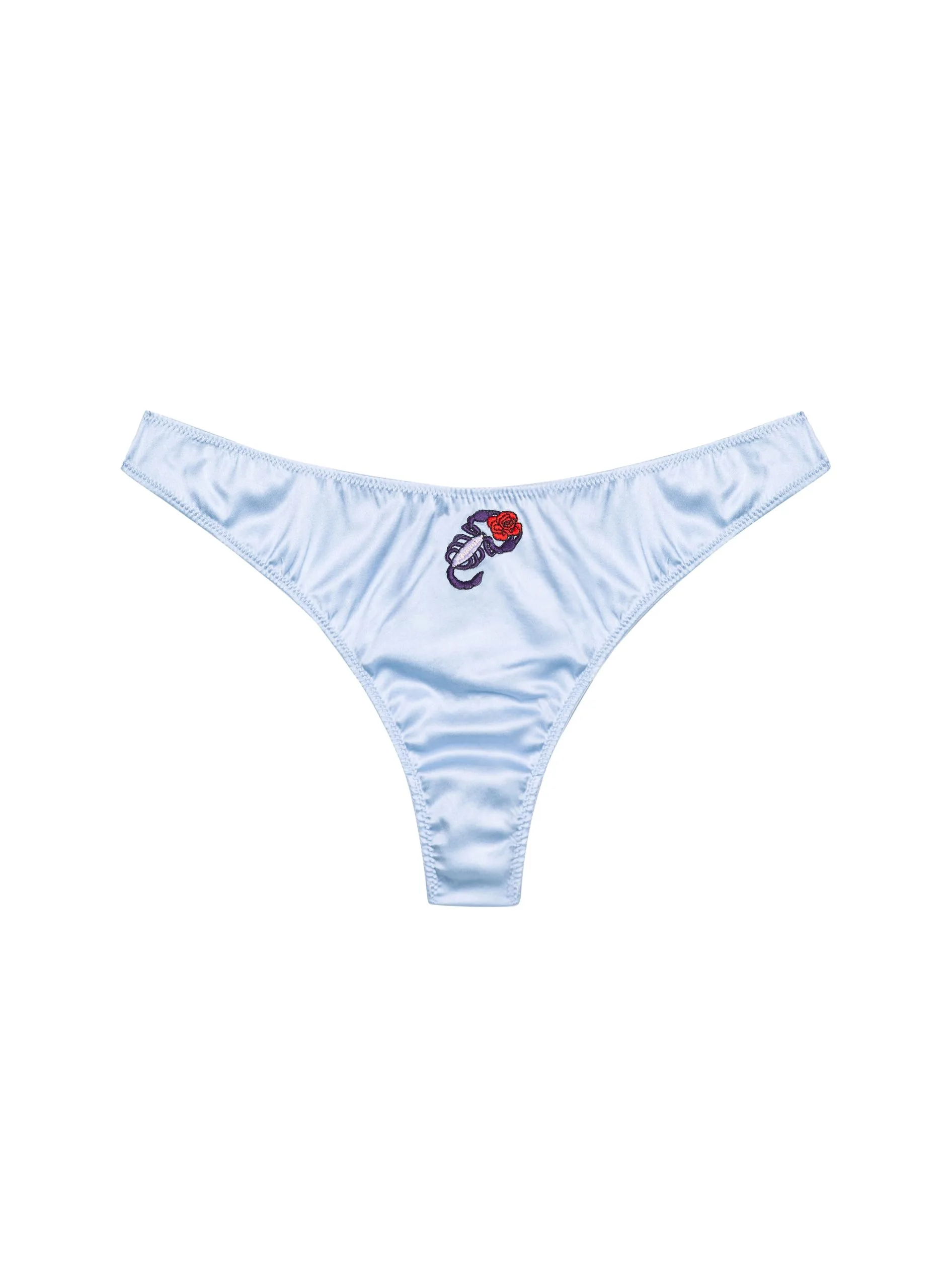 Written in the stars. Our favorite, super comfortable silk thong fits flawlessly under any garment. Features custom zodiac embroidery. Barely there feel with no elastic to dig in. Pair it with the Angel Sleeve Robe.
