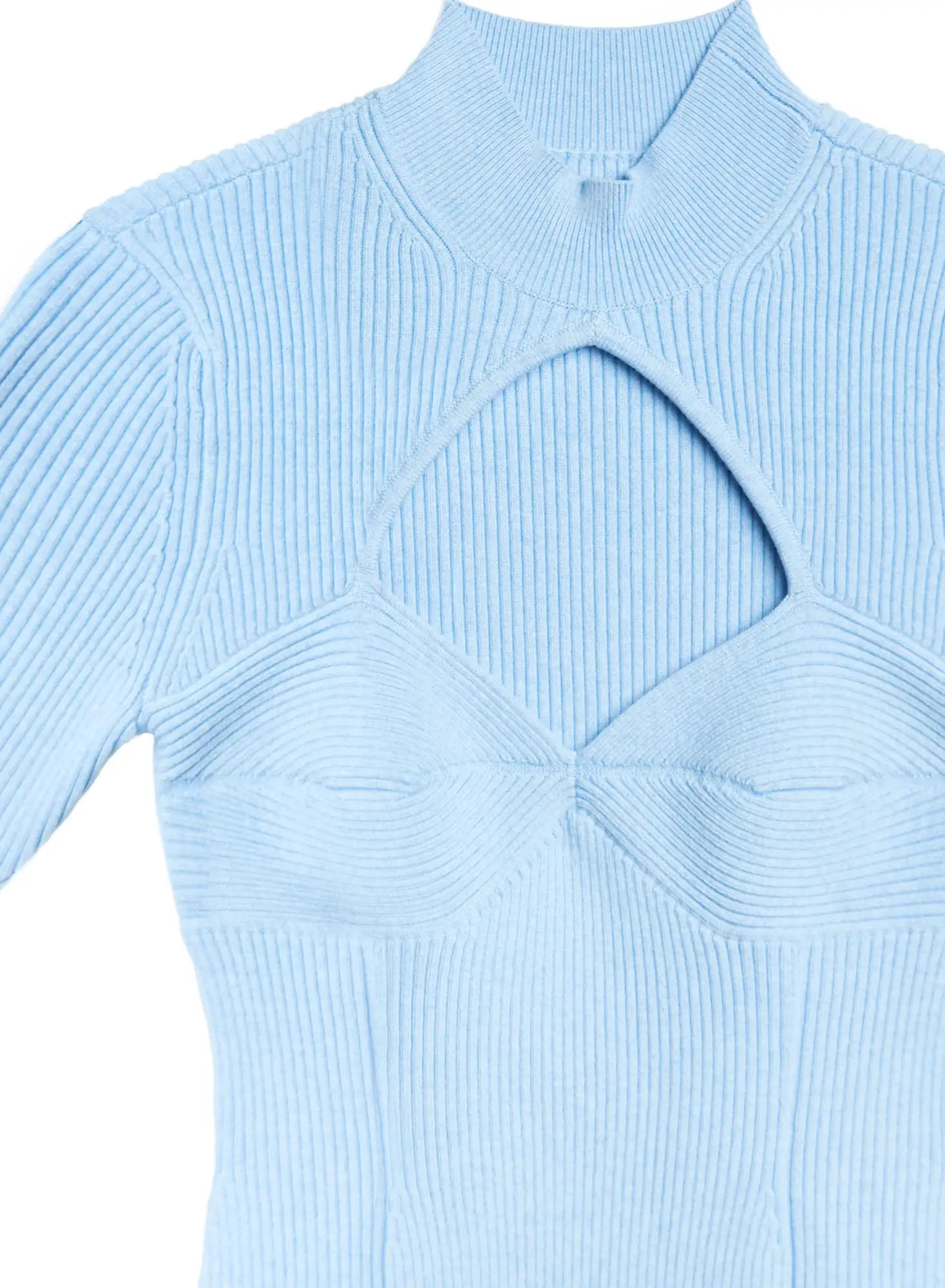 Cut it out. Our Short Sleeve Corset Knit Top with directional ribbing to sculpt and contour your figure. Features playful cutout and mock neck. Fitted style with garter inspired hem. Complete this ultra chic set with the matching Knit Rib Short.