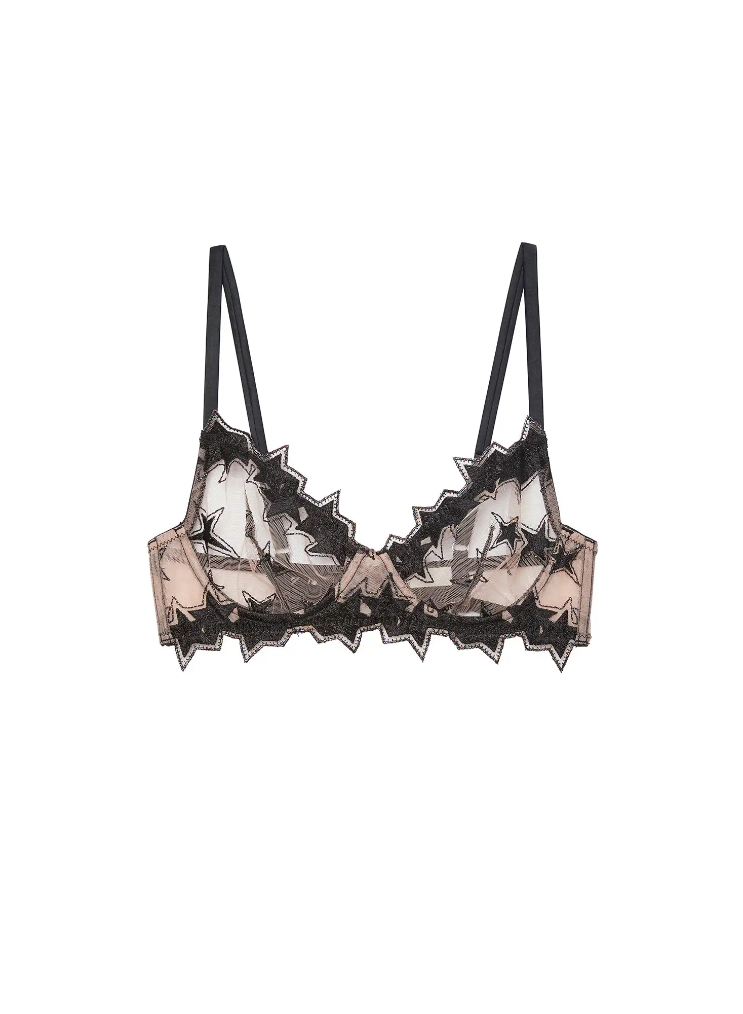 Superstar me. Our Super Star Embroidery Demi Bra features custom Italian embroidery. Demi-style cups with scalloped edge detailing. Adjustable straps and mesh bands with back hook and eye closure for a customized fit. Pair with the matching Super Star Embroidery Thong and Garter for an out-of-this-world set.