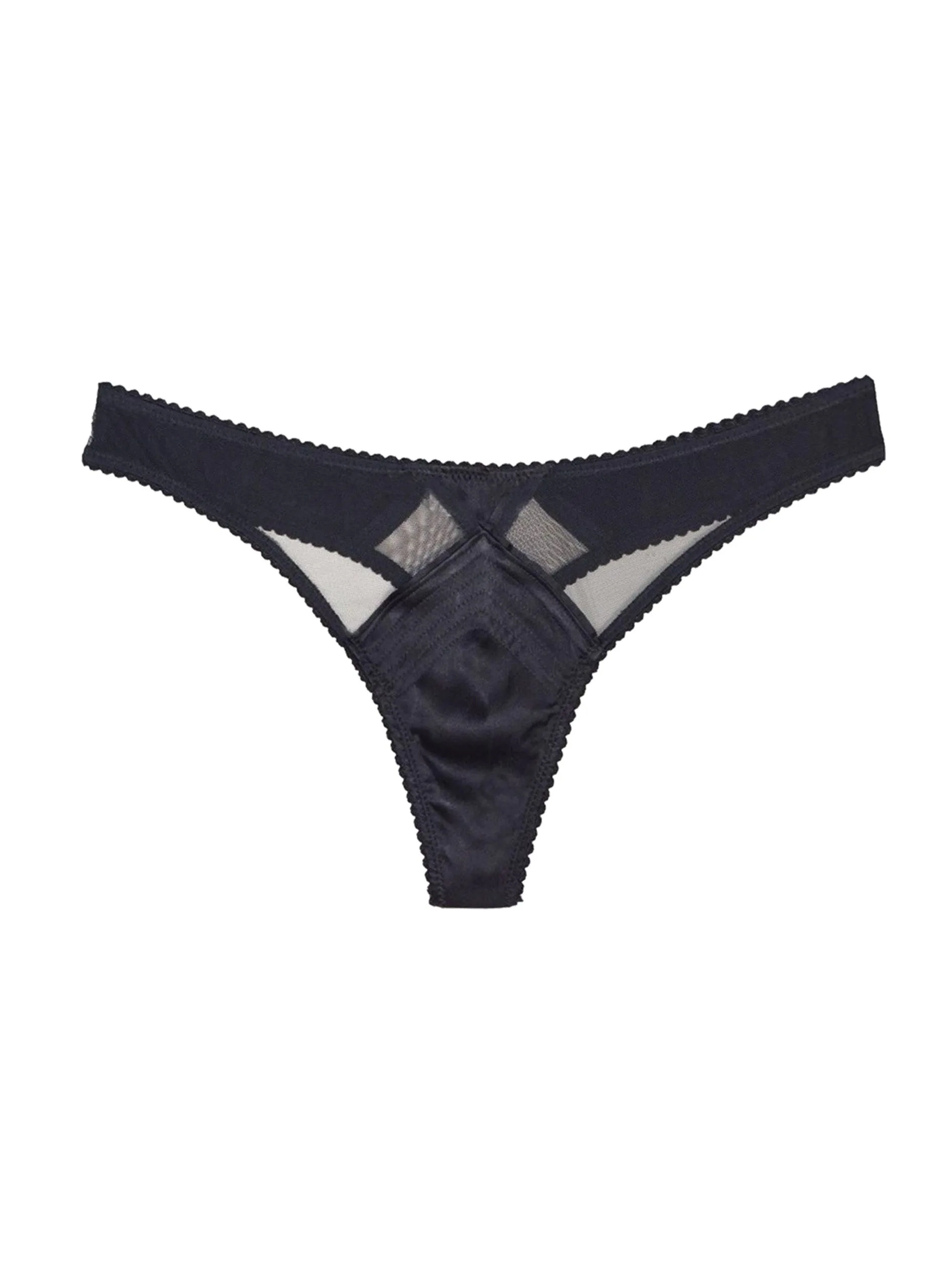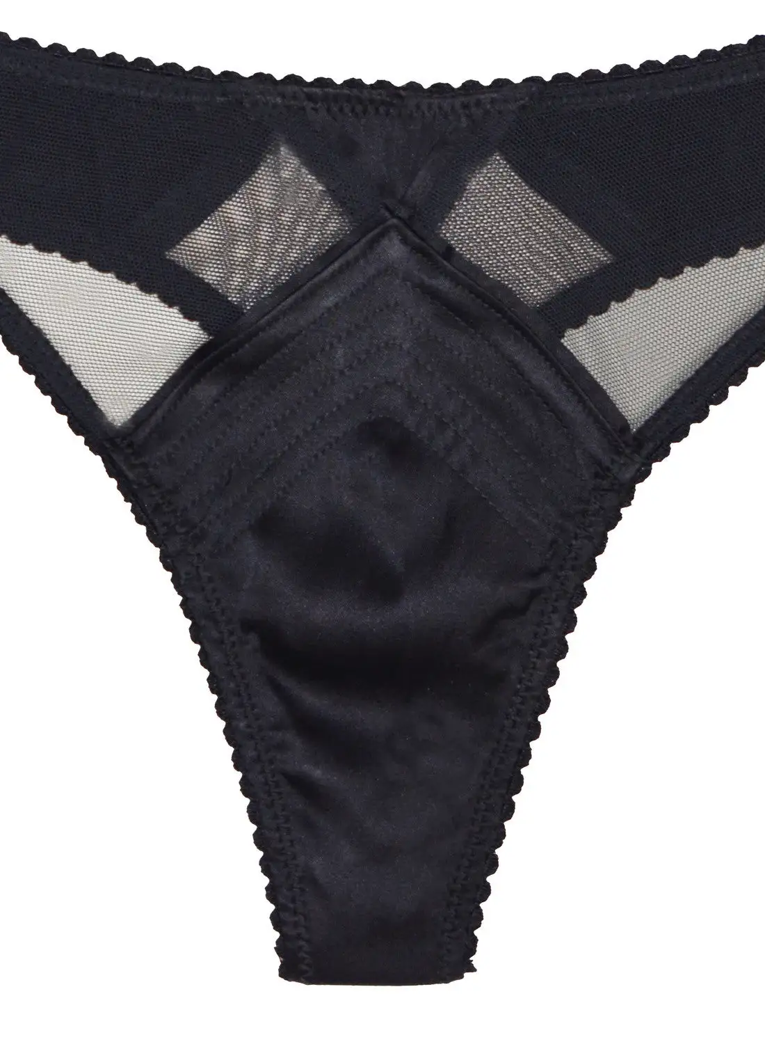 Ultra luxe silk satin thong with top stitch detailing at front and stretch tulle side panels. Pair it with the Top Stitch Convertible Bra and Top Stitch Garter Belt.