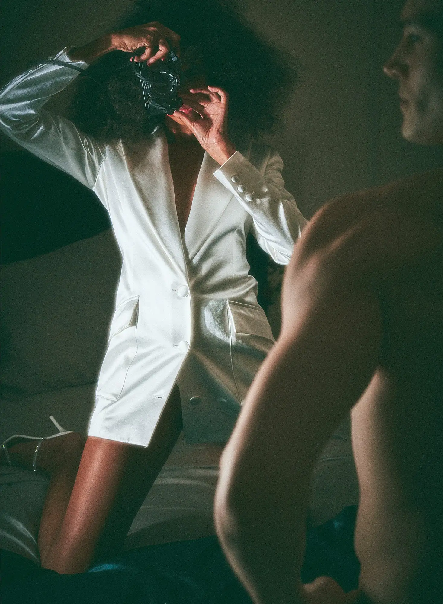 Tailored to tease. Cut from luxe Italian suiting fabric, our ultra chic Tuxedo Dress features a fitted blazer body with notch collar and long sleeves. Side pockets to hide all the essentials. Sexy mini length. Layer over the Charlotte Lace Seamless Thong for a night that’s all play, no work.