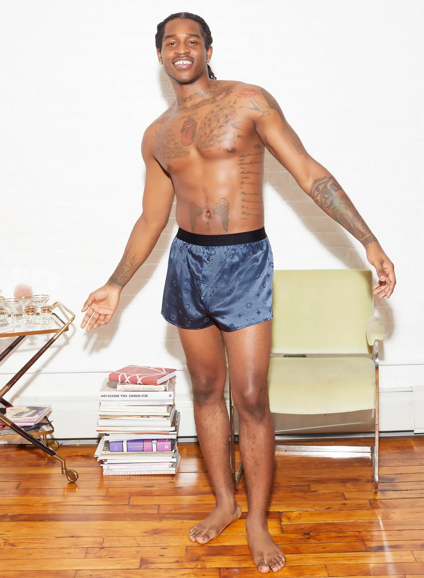 His & hers. Our ultra luxe silk Unisex Boxer Short in custom Fleur monogram print. Gender neutral with a comfortable fit. Features black elastic logo waist band and fly vent. Pair with the Men’s Silk Jacquard PJ Top or Luxe Triangle Bra.
