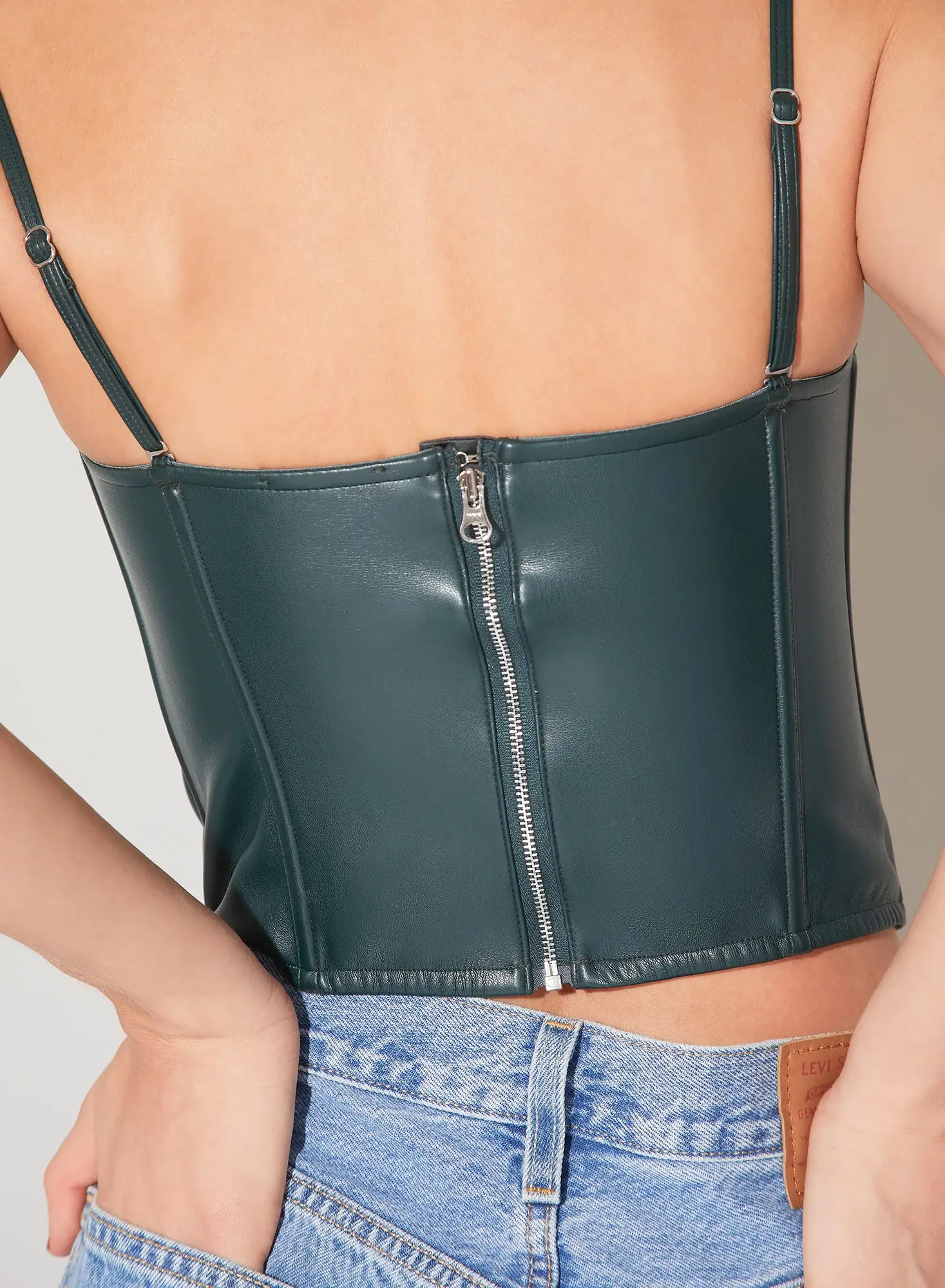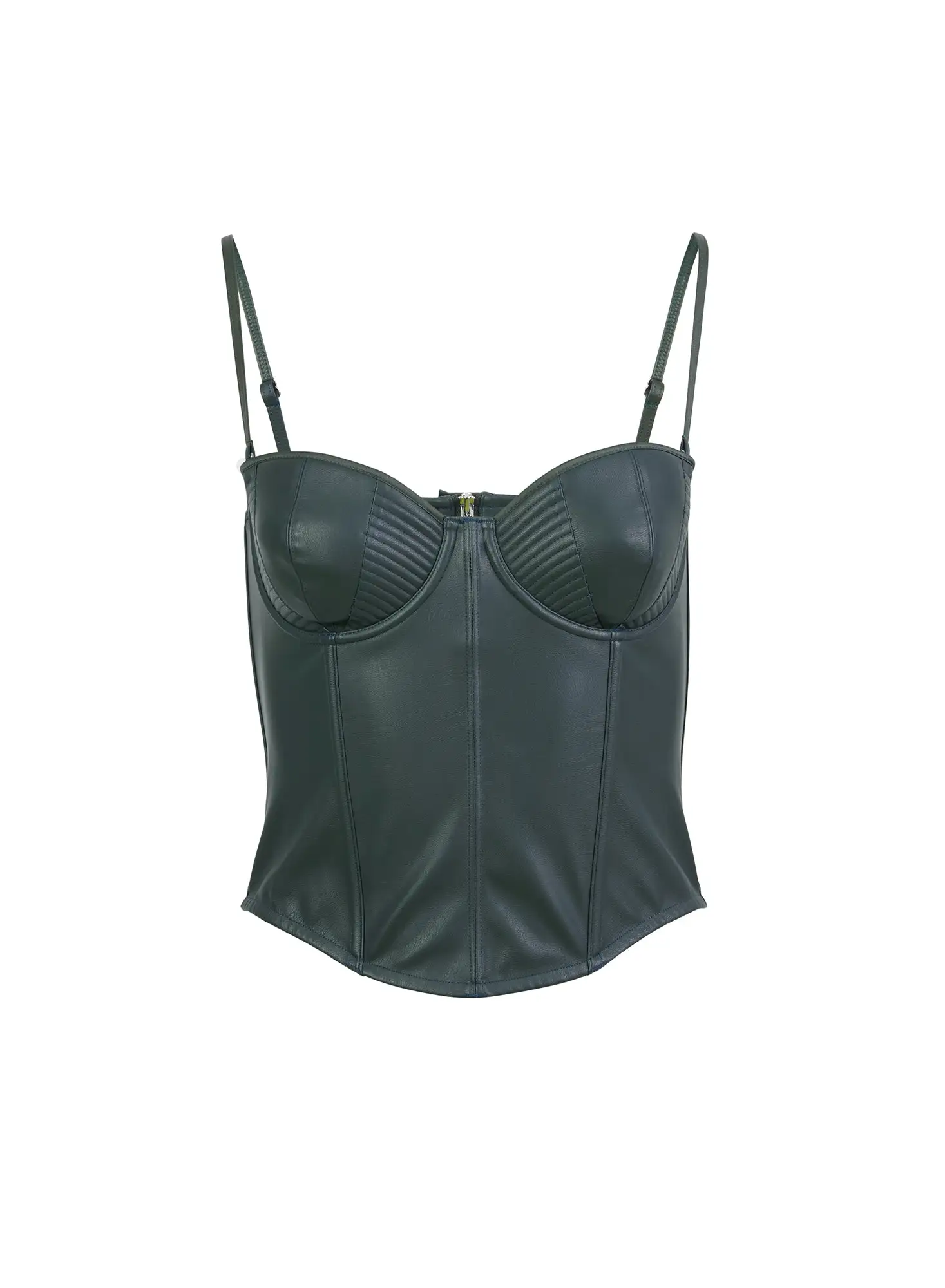 Leather me up. Our Vegan Leather Bustier features structured underwire cups with topstitch detailing. Soft boning and adjustable straps create the perfect shape. Exposed back zipper for added sex appeal. Looks chic with your favorite boyfriend jeans, or taken out with the High Slit Skirt for an all eyes on you moment.