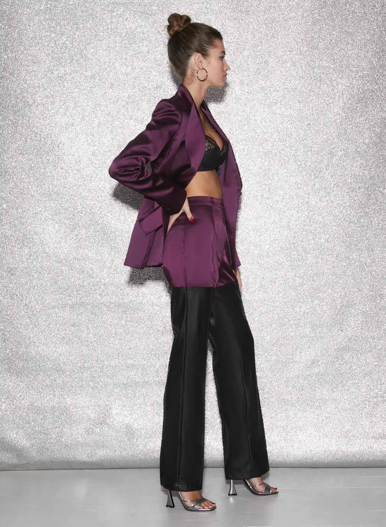 Hot pants. Our ultra chic Vegan Leather Combo Pant, cut from luxe Italian textured satin with soft vegan leather paneling. Tailored mid-rise fit with belt loops and back pockets. Suit up with the matching Tailored Blazer.