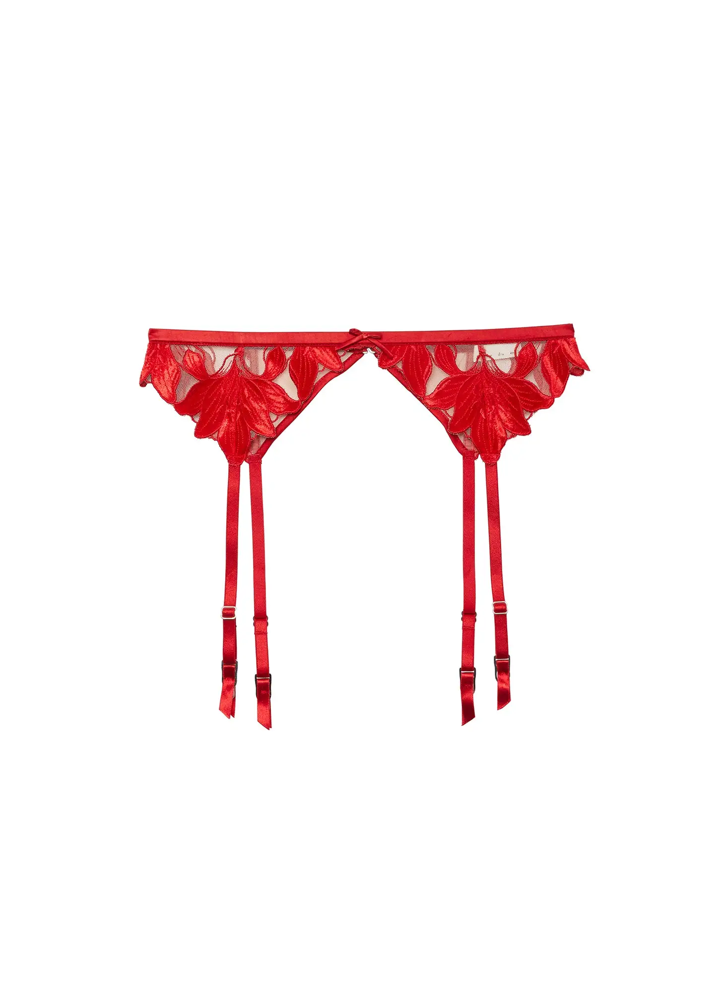 Heart in velvet. Our Velvet Lily Embroidery Garter Belt is the perfect addition to any bra & panty set. Features velvet lily embroidery and mesh panels. Center back closure sits at waist. Pair with the matching Velvet Lily Embroidery Plunge Demi Bra and Thong for an immaculate set.