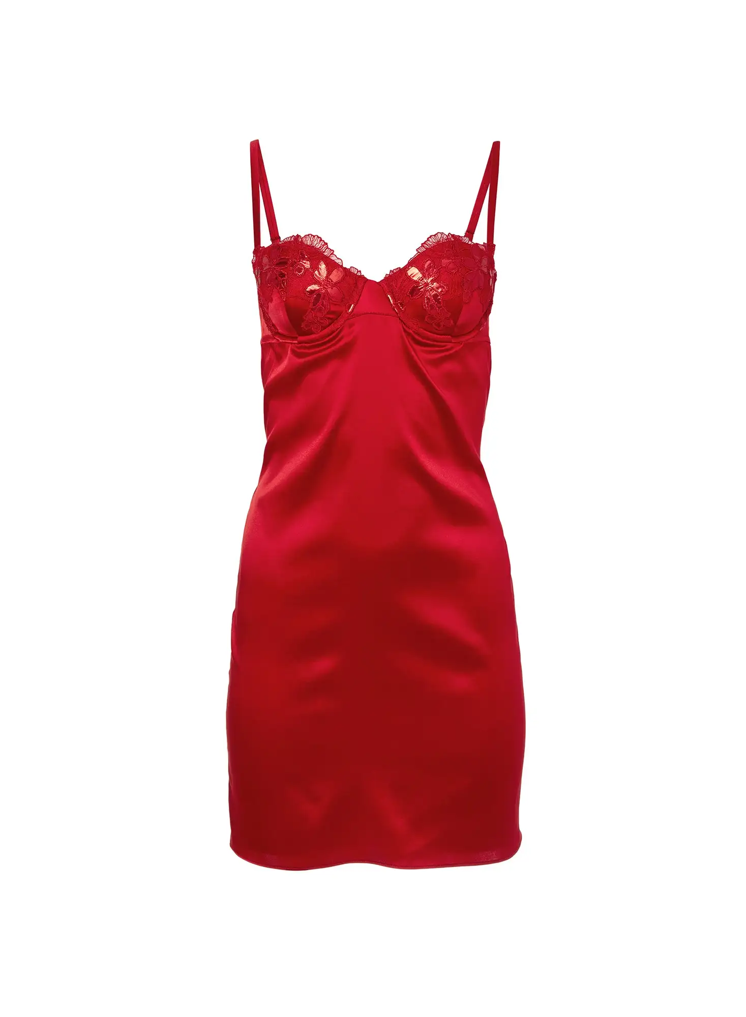 Red alert. Our Violet Cupped Slip Dress features scalloped lace with stunning metallic foil embroidery. Foam lined underwire cups for lift and support. Adjustable straps. Flattering silk charmeuse hugs every curve. Sexy mini length. All you need to slip into this look is the matching Violet Thong.