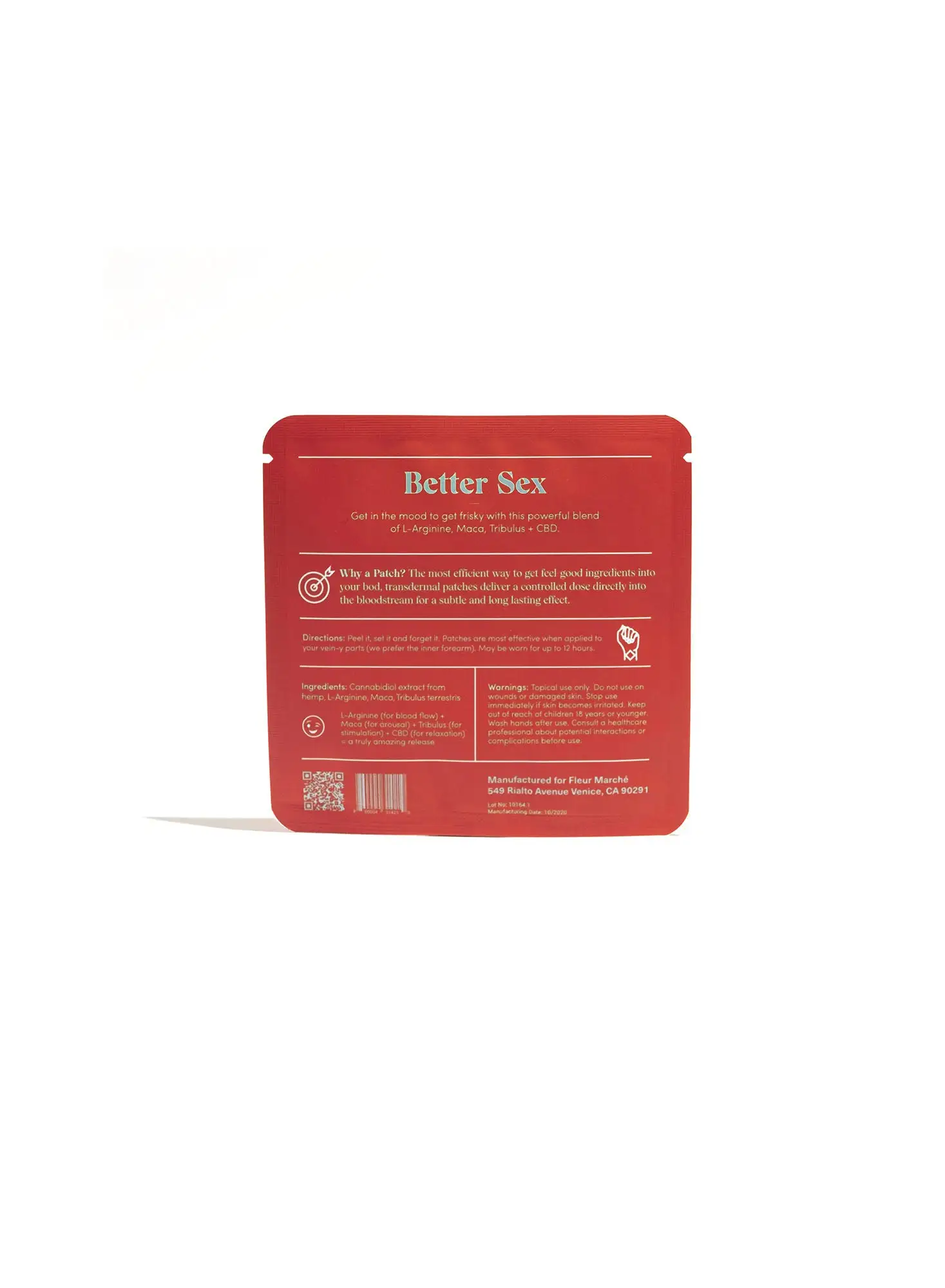 It’s time for better sex. Get in the mood to get frisky with Fleur Marché’s Sex Plz patches. A powerful blend of L-Arginine, Maca, Tribulus + CBD, patches deliver a controlled dose of ingredients directly into the bloodstream and last for up to 12 hours. Each pack contains 4 patches. Go ahead, get busy.