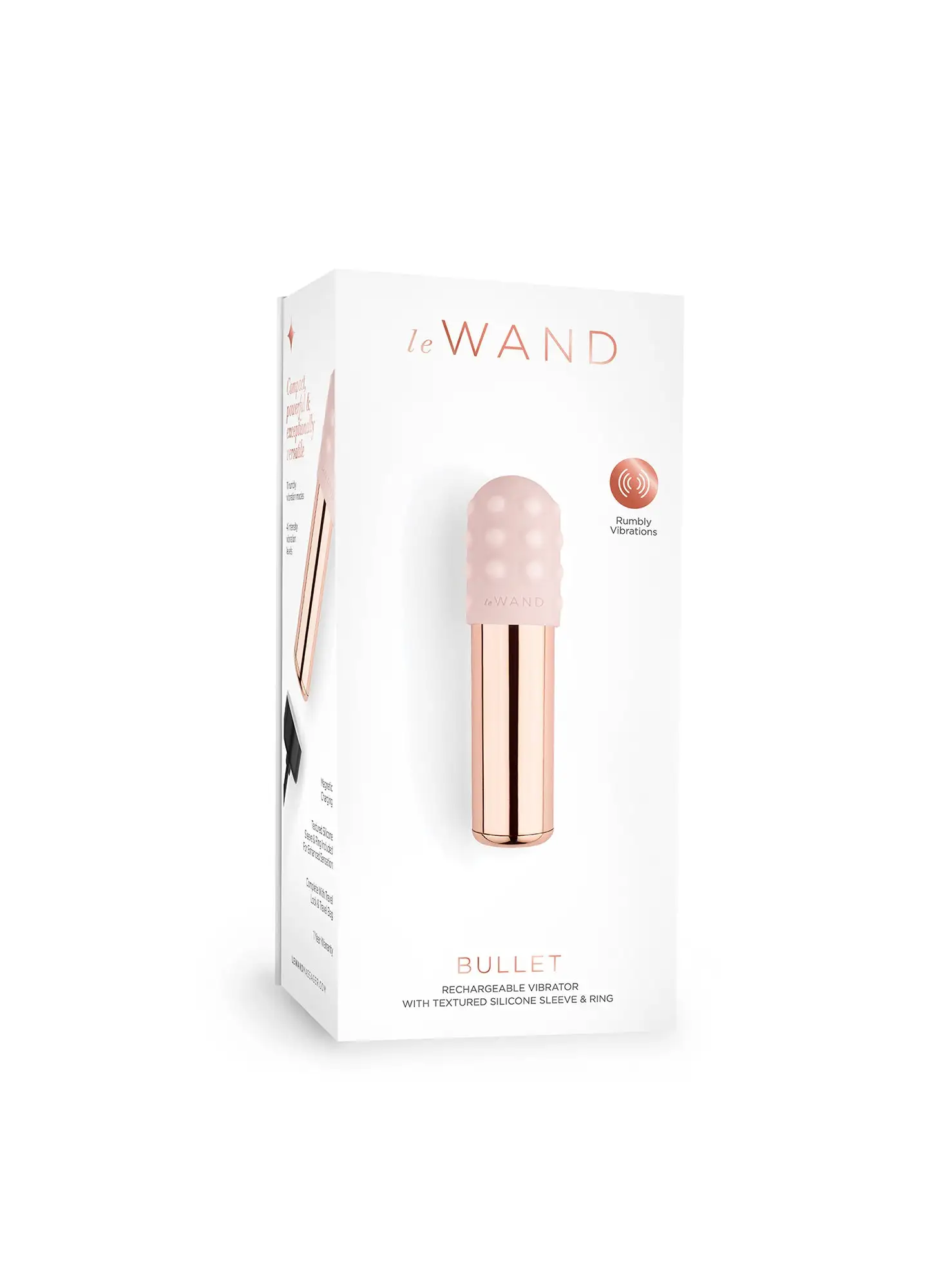 Good things come in small packages. Perfect for beginners, the Le Wand Bullet delivers powerful, penetrating pleasure in the convenience and versatility of a chargeable compact massager. Features one touch controls on the bottom while also being fully encased in body-safe metal. Comes with two removable textured silicone attachments to heighten sensation. This luxurious massager has four intensity levels and eleven vibration modes. Designed for both internal and external stimulation, listen to your body and let pleasure be your guide.
